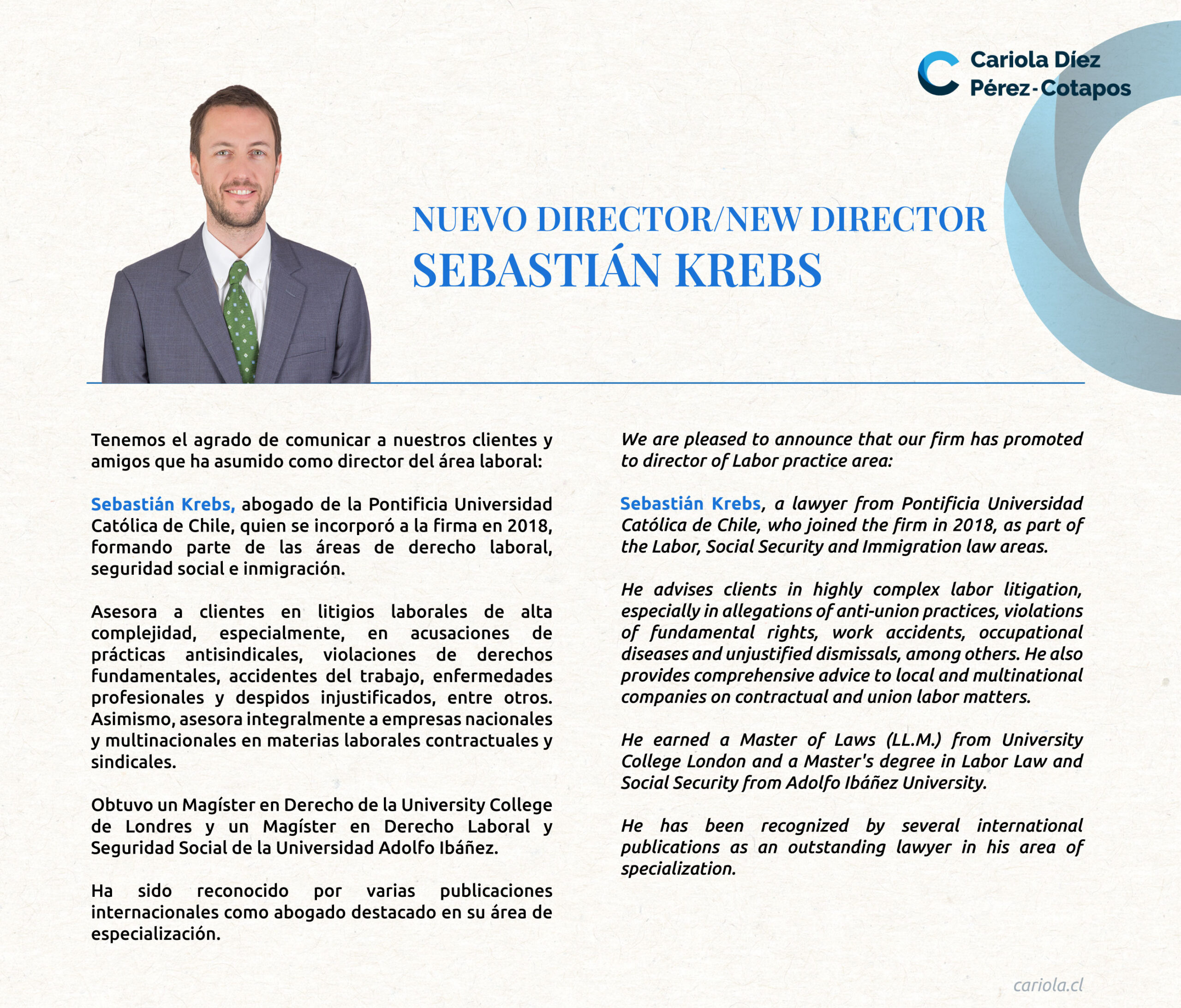 Sebastián Krebs, abogado de la Pontificia Universidad Católica de Chile, quien se incorporó a la firma en 2018, formando parte de las áreas de derecho laboral, seguridad social e inmigración.
